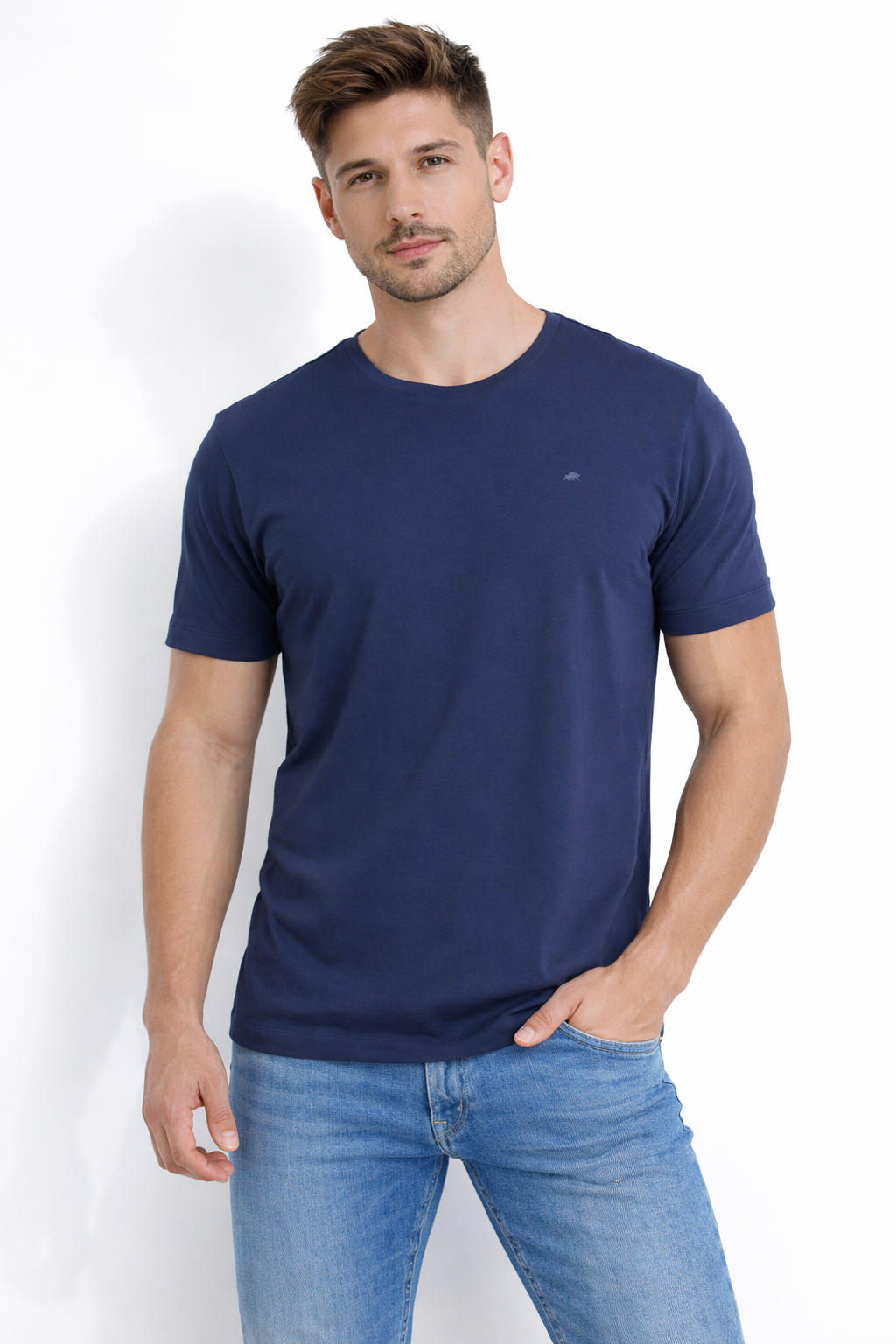 Uma peça essencial para quem busca elegância atemporal aliada ao máximo conforto. Confeccionada com 92% de algodão egípcio e 8% de elastano, esta camiseta azul-marinho oferece toque macio, caimento impecável e alta durabilidade, elevando o padrão das camisetas tradicionais.